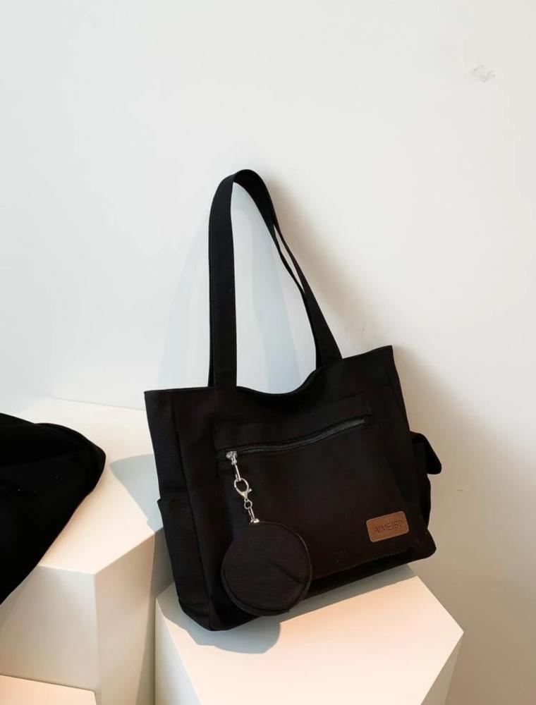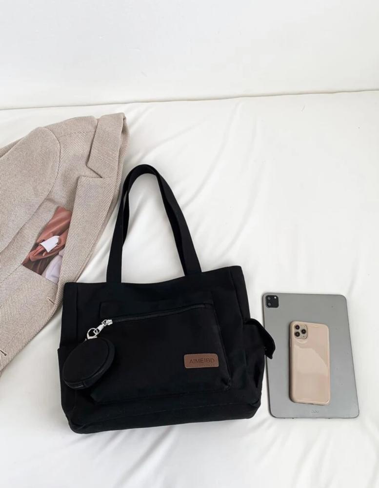 حقيبة كتف قماش كبيرة باللون الأسود بتصميم عملي وعصري يناسب الاستخدام اليومي والمشاوير الطويلة و مثالية للنساء الباحثات عن الراحة والسعة دون التنازل عن الأناقة.