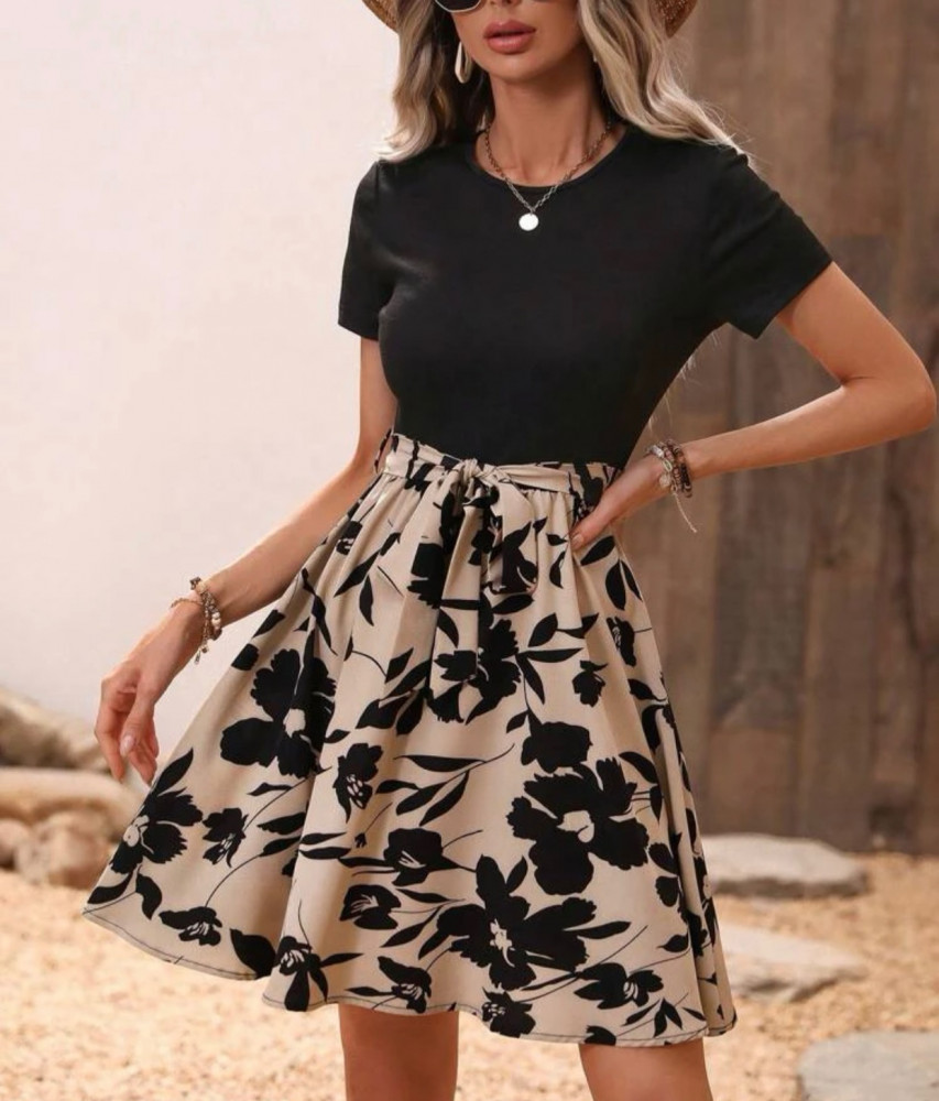 - اسم المنتج:فستان اسود بحزام مطبوع عليه زهور وبرباط من عند الخصر